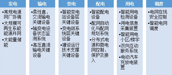 智能电网按产业链可以分为六个环节,分别为:发电、输电、变电、配电、用电及调度环节,以及通信信息平台的支撑:
