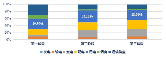 根据国家电网的智能电网发展规划,各环节投资占比较高的为用电环节、配电环节及变电环节,其中三个阶段用电环节所占比例分别为29.5%、33.1%及28.9%。具体数据分布如下: