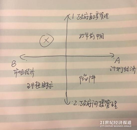 在这个坐标体系中,1A处在第一象限;1B意味着政府行政配置资源的市场经济,这不存在;2B是政府间接管理下的市场经济体系,这是改革的目标;2A是政府间接管理的计划经济。