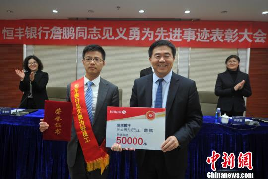 图为11月29日,恒丰银行福州分行举行见义勇为事迹表彰大会,授予詹鹏“见义勇为好员工荣誉称号”。 张斌 摄