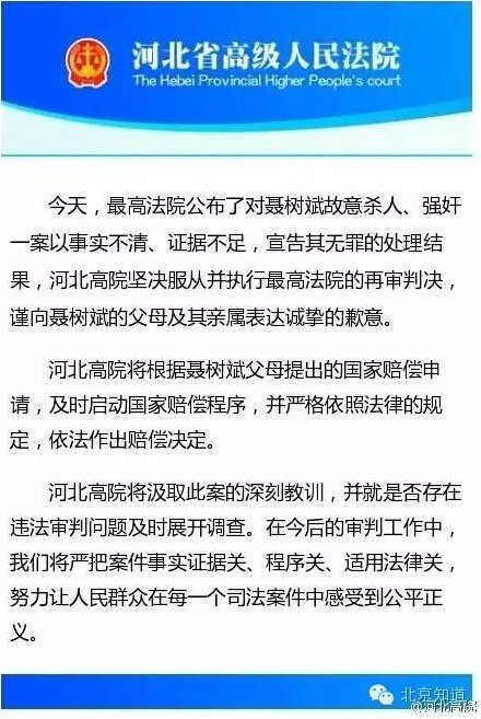 河北高院表示,坚决服从并执行最高法判决,并将根据聂树斌父母的申请,及时启动国家赔偿程序。将汲取此案的深刻教训,并就是否存在违法审判问题展开调查。