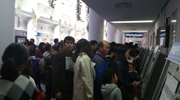大厅内的10台自助挂号付费终端前都大排长龙。