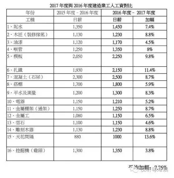 在最新的这篇新闻中,我们看到加薪幅度还是很高的,16个工种平均加薪幅度由3.8%至13.6%不等,平均为7.75%。其中加幅最高的工种为「天花间隔」,达13.6%,日薪增至1,000元,而混凝土工种加幅虽仅8.7%,但日薪可达2500元,是建造业工种之最。