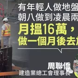 说起建筑工人的工资,无论是内地还是香港,都很高。内地的砌砖工人,挑钢筋的建筑工人一天三四百,更有甚者一天五百以上,这已经让目前很多白领汗颜。但是跟香港建筑工人一比,内地的建筑工人简直太逊了,香港建筑工人一天的工资就是2000港币。