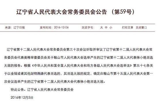 12月6日,辽宁省人大常委会在官网上发布公告称,确定由鞍山市人大选举出的辽宁省第十二届人大代表徐小艳当选无效。