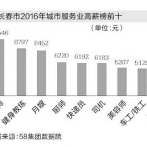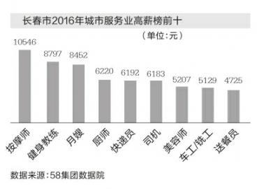 从榜单中可以看出,长春市2016年城市服务业高薪榜前十位分别是:按摩师、健身教练、月嫂、厨师、快递员、司机、美容师、车工/铣工、送餐员。其中,排名第一的按摩师平均月入10546元,健身教练排第二,平均月入8792元,月嫂以平均月入8452元排第三。即便是排名相对靠后的美容师、车工/铣工、送餐员,月薪基本都在5000元上下。