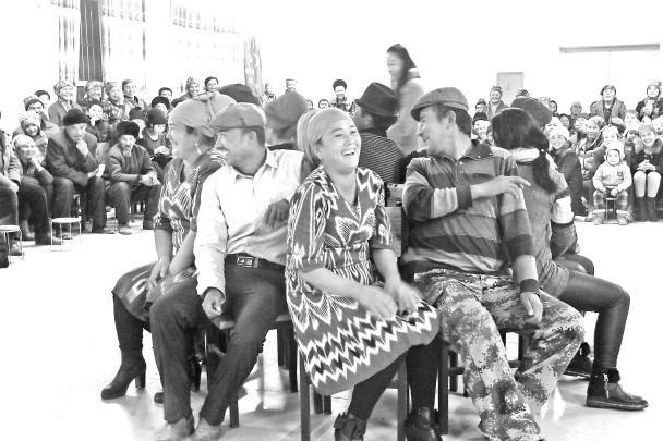 12月3日,沙雅县努尔巴克乡苏盖提托喀依村的村民在该村服务中心做游戏。当日,该村男女老少200余人齐聚一堂,开展第15次乡村百日文体活动。