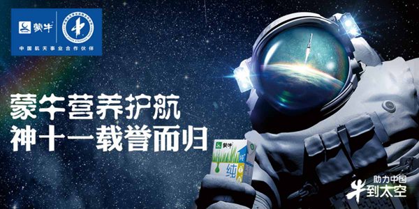 2003年,中国航天基金会工作小组从奶源、生产、市场等全产业链环节进行严格考察、检验,最终认定蒙牛乳制品符合航天员标准,授予蒙牛“中国航天事业合作伙伴”荣誉称号。自此,蒙牛一直为中国航天事业的发展提供营养支持,还资助培养航天人才、奖励为中国航天事业做出突出贡献的有功人员,支持学术研究和技术开发等。