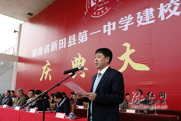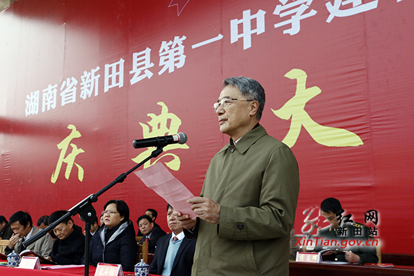 县政协副主席、新田一中校长龙石佑代表一中全体师生致辞。