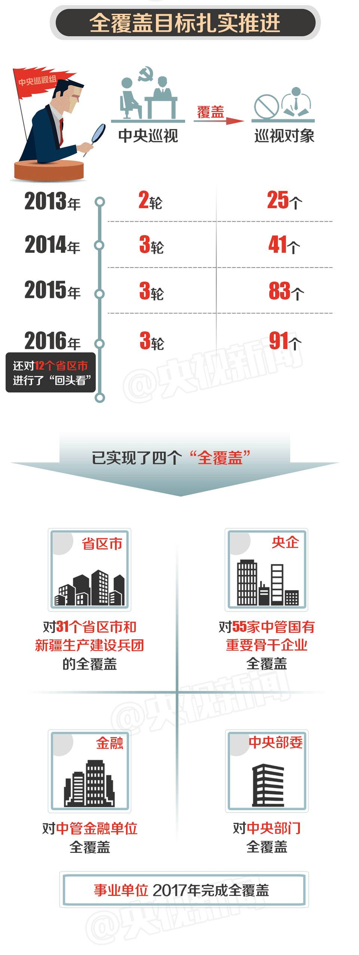 同时,第十一轮巡视15个巡视组也已全部完成进驻,这轮巡视结束后,十八届中央巡视全覆盖任务将完成近九成,实现一届任期内中央巡视全覆盖目标指日可待。