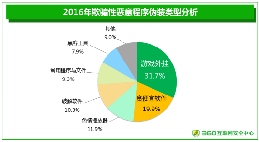 俗话说道高一尺,魔高一丈,在全面普及的安全软件绞杀下,更多的电脑病毒开始乔装打扮,精心伪装自己,骗得用户在安全软件发出警告的情况依旧将病毒“请”进电脑。据360最新发布的一份安全报告显示,2016年,3万个病毒样本通过伪装为游戏外挂、贪便宜软件等六类程序,成功骗过500多万用户,在电脑中做尽流氓推广、盗号、勒索敲诈的勾当。