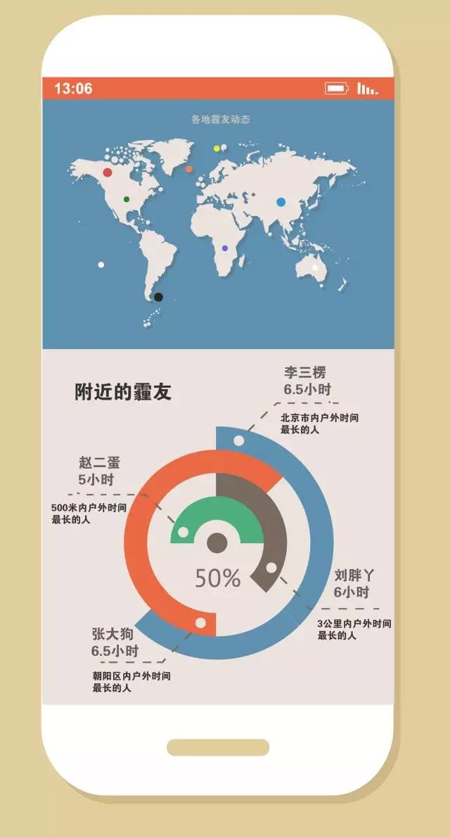 除了熟人社交外,我们还开通了摇一摇和霾友圈功能。查看附近的霾友,可获得吸霾时间排名和你在本地的排名,并且可以通过平台直接认识陌生霾友。即使我们走在一条街上,看不清五米之外的朋友,仍旧可以通过手机喜相逢。