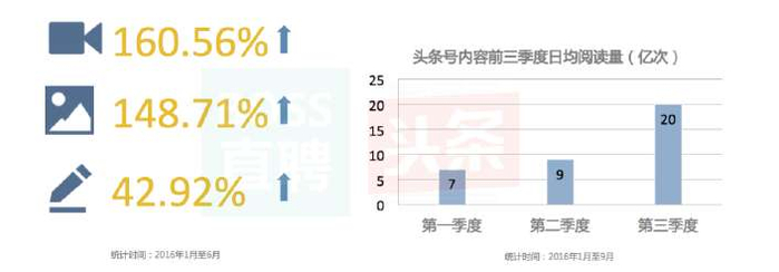 2016年是短视频和直播的爆发年。4G网络的进一步普及和流量费用的降低,为图片和视频内容的迅猛爆发提供了土壤。以今日头条为例,今年前三季度平台内容的日均阅读量从7亿翻到20亿;仅在上半年,视频和图片内容阅读量分别增长了160.56%和148.71%。