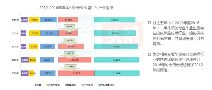 与此同时,媒体相关专业毕业生对互联网行业的向往比例在逐年迅速递升,2016年的比例已经达到了2012年的两倍。
