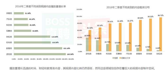 值得一提的是,播放量增长迅速的时尚、财经和教育类内容,其视频内容比例仍然很低,然而这些领域恰恰存在着巨大的视频内容制作空间。