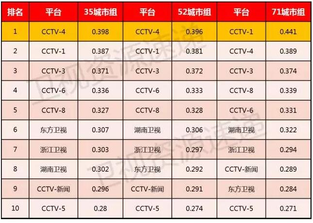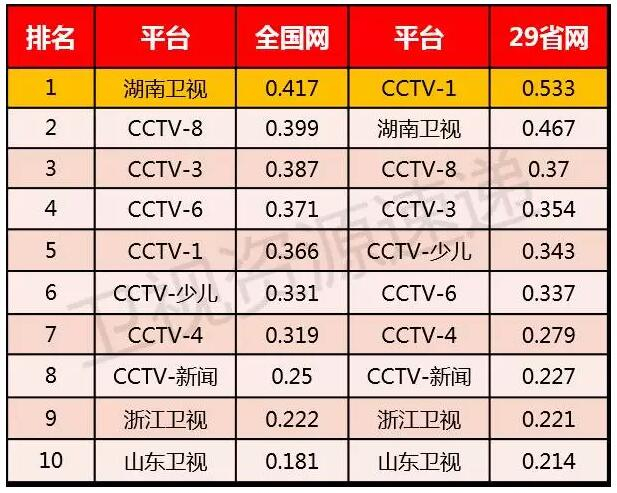 在全平台的全天收视率排名中,央视各频道优势较大。