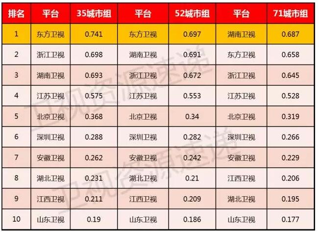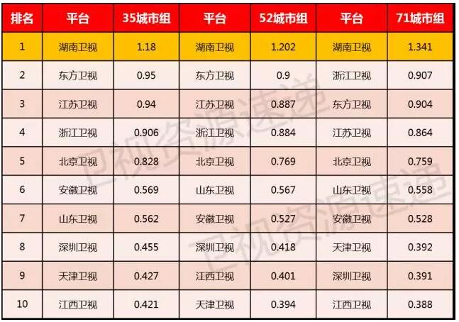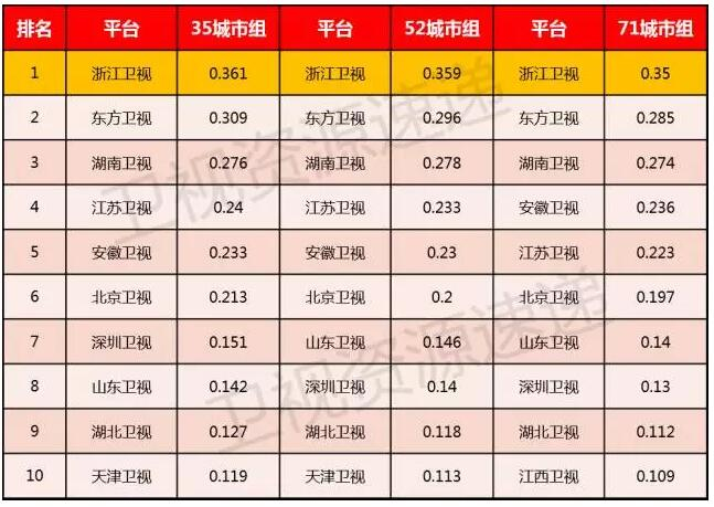 图表4:2016年省级卫视35城市组、52城市组和71城市组全天收视率(%)