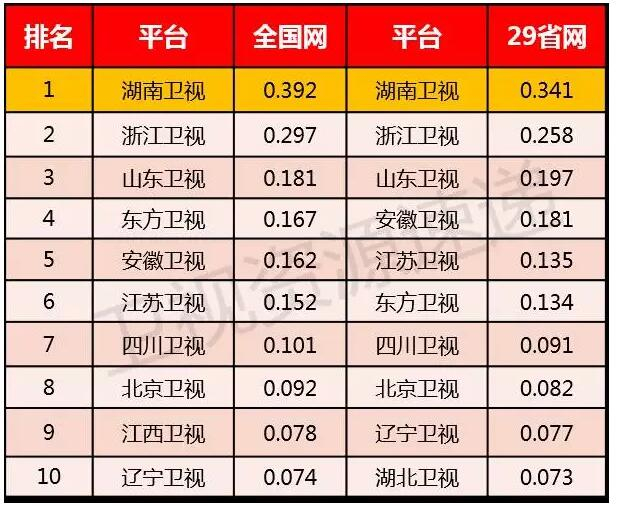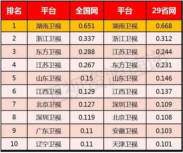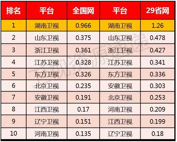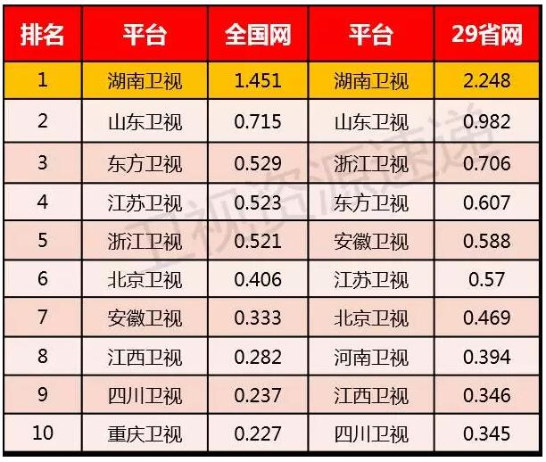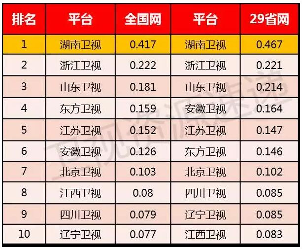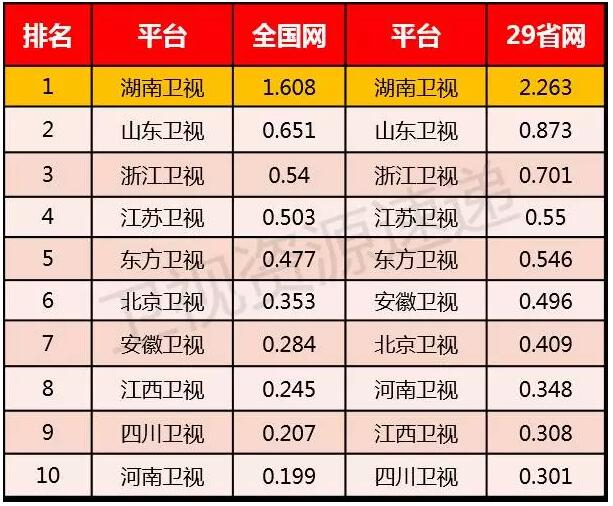 卫视中湖南卫视的影响力主要在全国网和省网,多时段排名第一,全国网全天收视甚至超过央视综合频道,省级卫视中5大网别和3大时段(全天、0800-1800、1800-2400)取得第1位共11次,为卫视中最多。