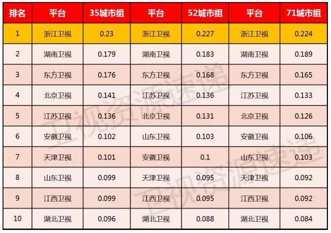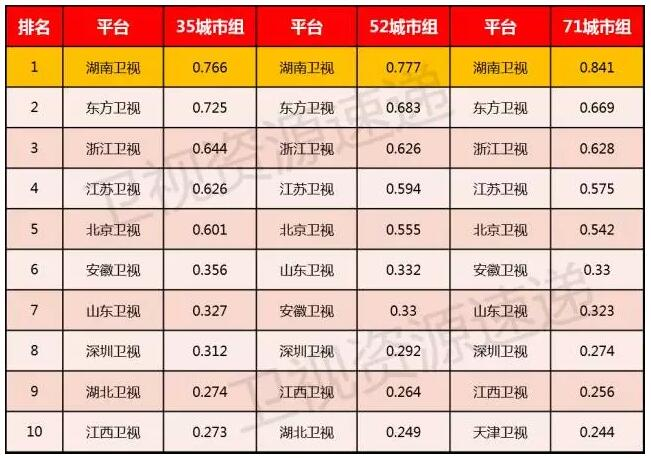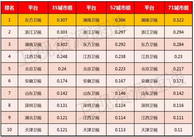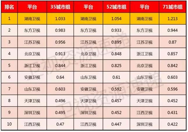 其城市组尤其是35和52城市组的影响力更深一些。白天时段 表现尤为突出,全国网和29省网排名第二,各城市组排名第一。晚间时段各网别稳定为第三,具体来说次黄时段相对晚黄时段表现更佳。但其晚间黄金剧场的表现 有待提升,各网别以第4、第5为主,晚间收视更多靠其综艺。