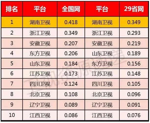 山东卫视和安徽卫视在全国网和29省网较有收视优势,其中山东卫视拿下省级卫视全天、白天收视双网第三,晚间尤其是黄金剧场双网第二;安徽卫视在下午时段位列双网第三。