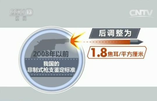 专家介绍,类似的枪支鉴定标准,香港是7.077焦耳/平方厘米,台湾是20焦耳/平方厘米,俄罗斯是19焦耳/平方厘米,美国是21焦耳/平方厘米。2008年以前,我国的非制式枪支鉴定标准是16焦耳/平方厘米,后调整为现在的1.8焦耳/平方厘米,不到原来标准的九分之一。