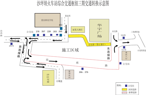站东路交通转换示意图 沙坪坝区供图 华龙网发此外,公交113、203、228、266、276、472路的起点站也将进行调整,分别是:113路起点站由站东路调整至东连接路,203路起点站由站西路南侧调整至站西路北侧(原267位置),266路、276路起点站由站西路调整至站南路,228路(外环线)起点站由站东路调整至站西路,472路起点站由站东路调整值天陈路重师大门南侧。