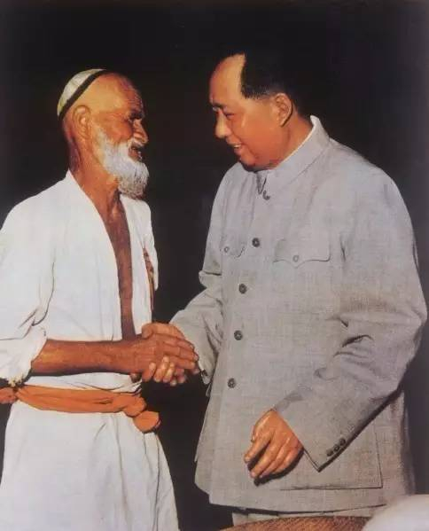 1958年6月28日,怀仁堂。女摄影家侯波的镜头里,库尔班老人精神矍铄,目含感激,双手与毛主席的手紧紧相握,毛主席面带微笑。