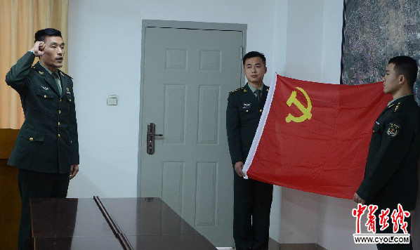 2017年1月13日,面对鲜红的党旗,王晓冬举起右手,进行拥护改革宣誓。 祝成林 摄