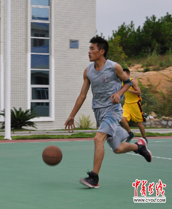 飞行员王晓冬酷爱篮球,有个外号叫“黑曼巴”,这是他在篮球赛上的矫健身影。 冯高俊 摄