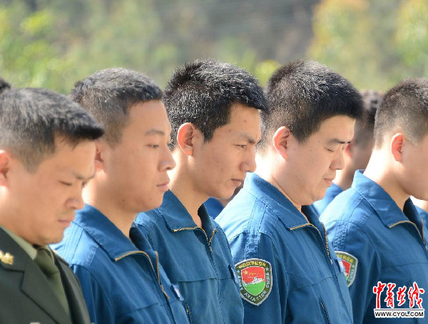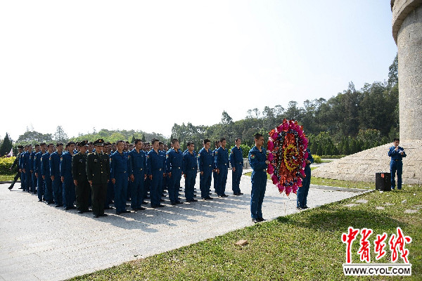 张浩和王晓冬所在飞行队向革命烈士纪念碑敬献花圈并默哀(第一排第三位为张浩) 。肖庆明 摄