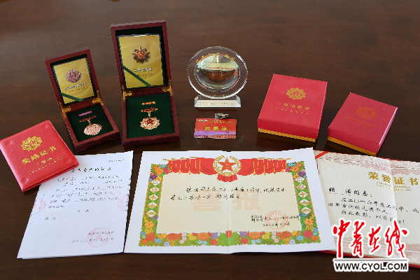 2017年1月22日,整理烈士遗物时,飞行员张浩的部分奖章证书被整齐地摆放在桌上。 赖桥泉 摄