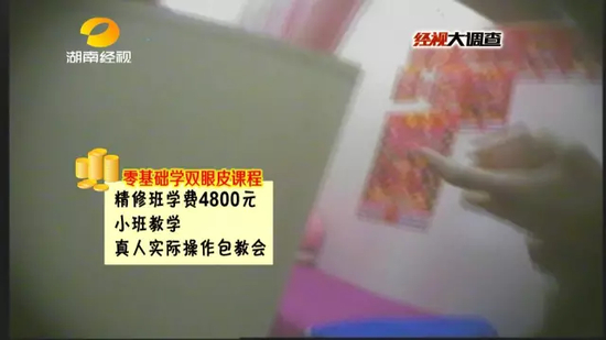 根据网络广告,记者来到株洲的“华莉”微整形培训机构表示想要参加双眼皮课程。这里的负责人肖姐十分警惕,在多番核实记者身份后,最终同意记者约见总负责人刘老师。这位刘老师告诉记者,零基础交钱就可以参加培训,机构的工作人员表示精修班学费4800元,小班教学真人实际操作包教会。