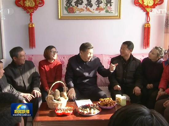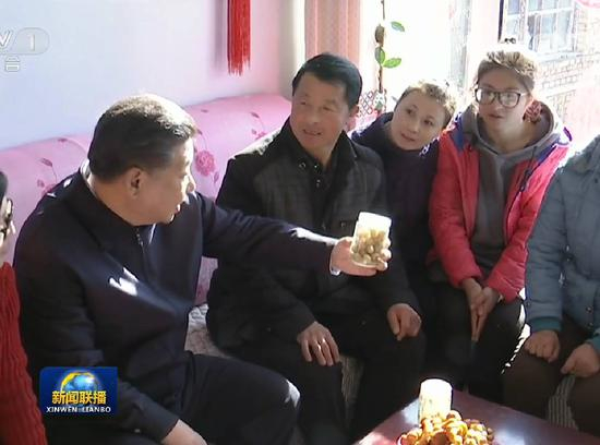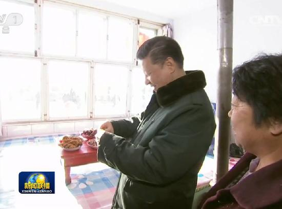 在徐万家,习近平问喝的用的水从哪里来,电视机啥时买的、能看多少频道,过年安排哪些活动。一家人你一言我一语作了回答,习近平听后说我这就放心了,看到家里摆的年货,习近平拿出油炸的“开口笑”品尝,说味道很好。