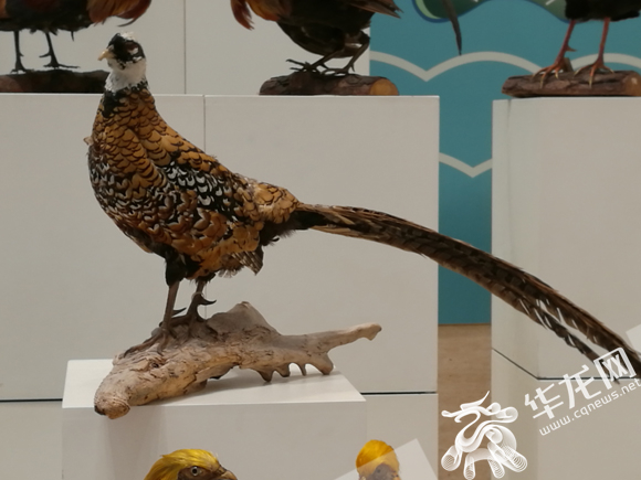 在最高的那个展台上,立着一个大鸟标本,眼尖的市民立刻认出,这不是孔雀吗?它也是鸡?旁边的介绍展板上注明,这是蓝孔雀。“孔雀被视为百鸟之王,但它其实也是雉鸡的一种,属鸡形目、雉科。因此,从广义上来讲,孔雀也是鸡的一种。”重庆自然博物馆工作人员表示。