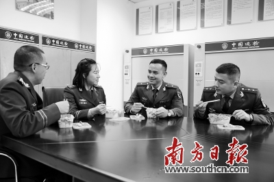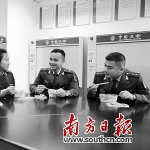 春节期间,从早上7时到晚上11时,出入境航班一班接一班,执勤边检官兵们吃饭、休息的规律早已被打乱。除夕更是备战的高峰,他们甚至连到饭堂就餐的时间都已抽不出,通常只能在备勤室围坐一起吃个快餐盒饭,与家人、小孩通个简短的视频电话,这就是边检官兵春节与家人“团圆”的方式。