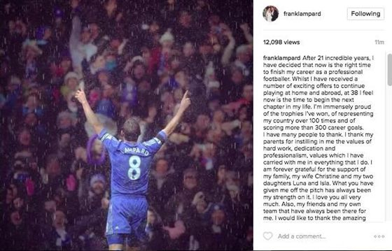 兰帕德在Instagram中写道:在度过不可思议的21年职业生涯后,我决定现在是时候结束职业球员生涯了。我收到了海内外许多球队的热情邀请,但是38岁的我决定翻开人生新的一页篇章。让我感到骄傲的,不光是自己赢得的无数奖杯,还包括代表国家队的超过100次出场,以及生涯中打进的超过300粒进球。