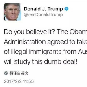 “你们能相信么?!奥巴马政府居然同意把澳大利亚成千上万的非法移民接到美国来!这是为什么?让我好好研究研究这个傻X协议!”