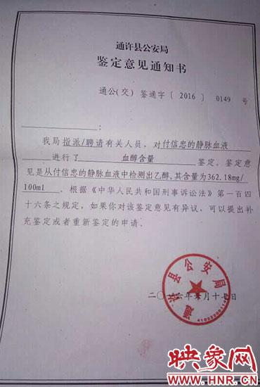 随后,付信忠驾驶宝马继续逃逸,被在街面巡逻的通许县公安局特巡警当场截获。经通许县公安局鉴定,付信忠血液中乙醇含量为362.18mg/100mL,远远超过80mg/100mL的醉驾标准。