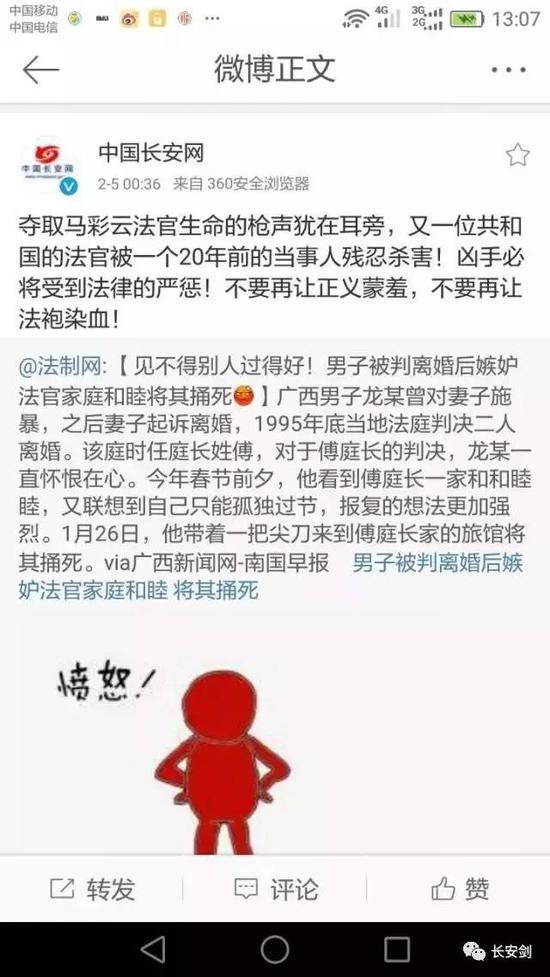 网友“菜菜”:这样耸人听闻的事情并不是第一次,上一次躺在血泊里的是马彩云。有人说,愤怒和谴责是徒劳的,但这个社会的良心正在于此——即使做恶的人是极少数,大多数人不会无动于衷。如果当下次法官被害不被刷屏的话,死掉的就不单是那一个法官的肉体,而是众法官的心了。刷屏不能让人复活,但愤怒与谴责依然有价值。意义便在于此。不能让法官心寒。依法严办,绝不留情。