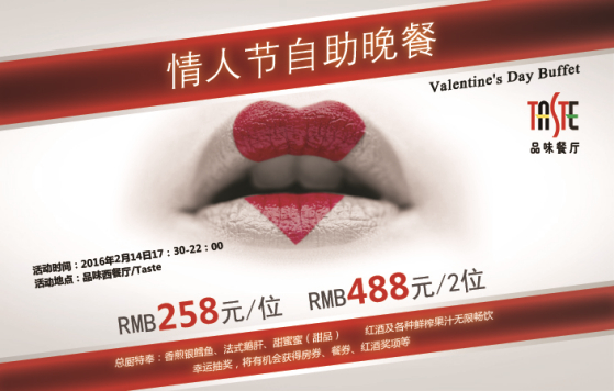 2月14日品味西餐厅推出情人节自助晚餐,258元/位,488元/2位,为每对情侣提供红酒畅饮、各种鲜榨果汁和鲜红的玫瑰,现场更有小提琴演奏营造浪漫气氛,还有情人节总厨特别奉献佳肴:香煎银鳕鱼、法式鹅肝、甜蜜蜜(甜品)等美食,到场消费的每位情侣都有机会抽取神秘奖一份。