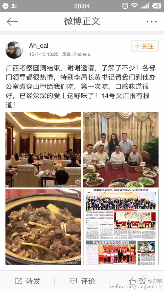 众所周知,穿山甲是国家二级保护动物,违法捕食涉嫌刑事犯罪。从微博截图中可以看到,这顿吃喝在广西,时间是2015年,作陪的有当地政府各部门领导。由于年轻人在微博中说,自己已经深深爱上了穿山甲的美味,所以,依照他这样的日常生活层次,是不是有更多的穿山甲命丧其口?