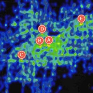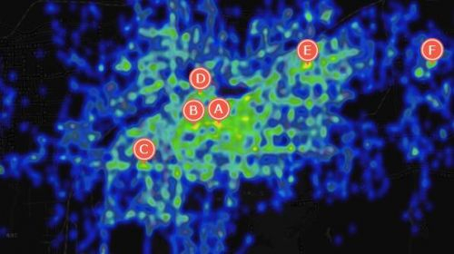 从骑行地点的分布热力图可以看出,形成了六大主要骑行地区域,分别是骑行量较大的