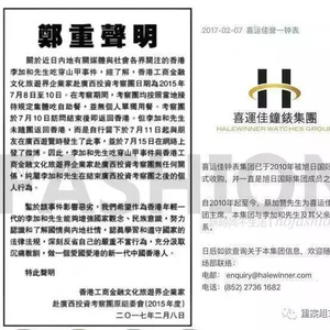 ▲香港工商金融文化旅游界企业家赴广西投资考察团原组委会、喜运佳钟表集团声明。
