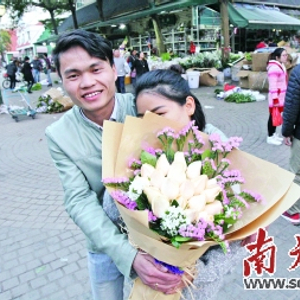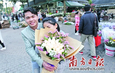 | 深圳一位男士买了鲜花送给女伴。 南方日报记者 鲁力 摄 |
