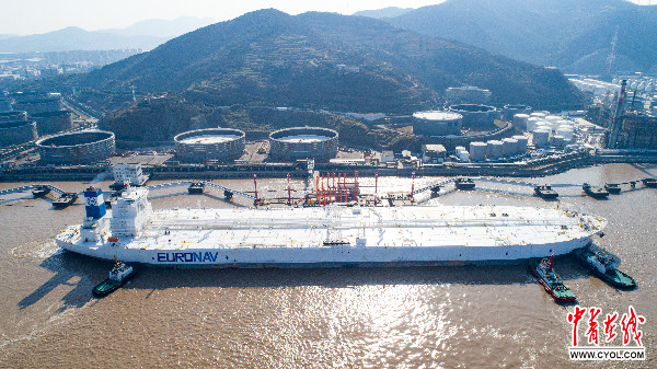 载重40多万吨的海上“巨无霸”原油轮首次停泊宁波舟山港。(胡泽波、郑凯供图)