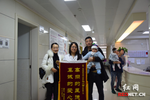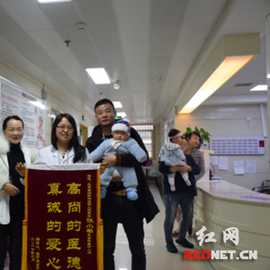 红网张家界2月15日讯(通讯员 谭小林 欧爱群 胡媛)2月14日上午,侯万虎全家带着一面“高尚的医德,真诚的爱心”的鲜红锦旗,来到张家界市永定区妇幼保健院儿科住院部,向为其孩子小虎(化名)进行精心治疗的张晓晴医生以及提供热情服务的全体医护人员表示感谢。