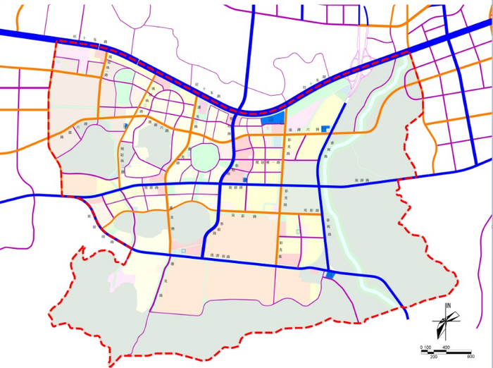道路交通规划方面,规划形成“两横三纵”的城市干路体系,“两横”为美里路和规划路,“三纵”为二环西路,创业路和东宇大街。同时考虑用地开发需求,对部分城市支路采取弹性控制。
