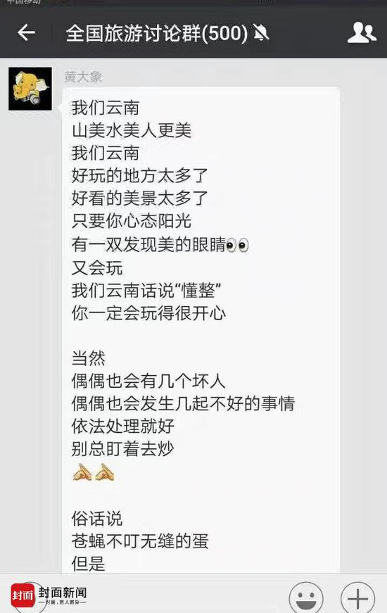 2月17日下午,封面新闻-华西都市报记者致电云南省旅游发展委员会。该委员会办公室一位工作人员证实,云南旅发委市场处处长名叫黄林武,平时不仅喜欢旅游摄影,还喜欢以网名“黄大象”,通过网络社交媒体上发表一些个人言论。毕竟很多话,作为官方不能说也不好说。关于炮轰记者苍蝇的诗歌,可能是每个人的看法不同。