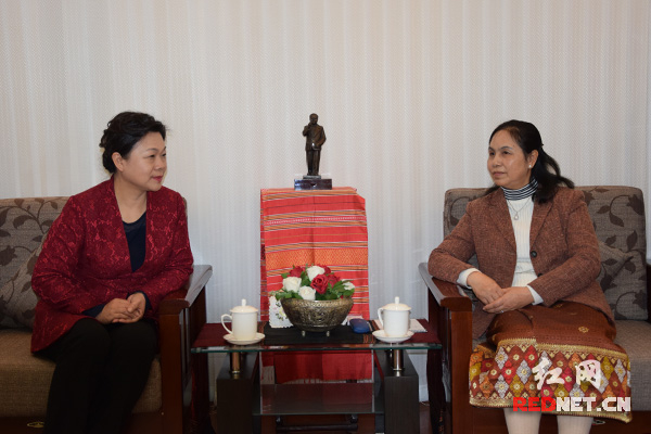 肖百灵向万迪·布达萨冯致以新春问候,感谢她为推动湖南与老挝的交流与合作所作的贡献。近年来,湖南与老挝的友好关系不断深化,人员交往密切,高层互访频繁,尤其在经贸、文化、教育、旅游、农业等方面的合作日益加强。肖百灵表示,湖南省人民政府外事侨务办公室十分重视与老挝的友好交往,将继续推动湖南省与万象市正式缔结友好省市关系,湖南企业与人员赴老挝投资发展,以及长沙-万象直航航线正常运转等工作。