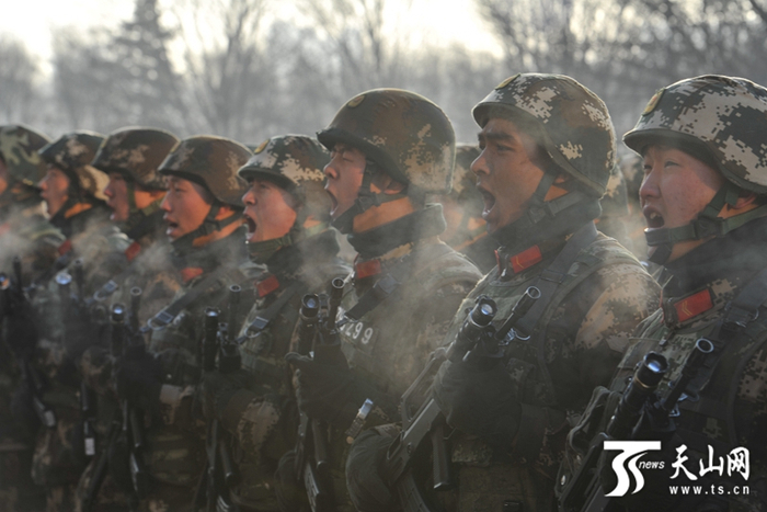 参加誓师大会的武警官兵在宣誓,声音响彻天际。(新疆日报记者卢民一 邹懿摄)